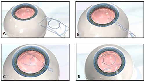 Eine Laserbehandlung (LASIK oder PRK) eignet sich nur zur Korrektur geringer und mittlerer Fehlsichtigkeit und Hornhautverkümmung. Bei hoher Fehlsichtigkeit bieten Kunstlinsen eine Alternative. Kunstlinsen werden entweder im Austauch gegen die natürliche Augenlinse (refraktiver Linsenaustausch) oder zusätzlich zur natürlichen Augenlinse in das Auge eingesetzt (phake Intraokularlinse/phake IOL). Phake IOL (A) bestehen aus Kunststoff oder einem faltbaren Material. Sie eignen sich vor allem bei jüngeren Patienten, die noch keine Lesebrille benötigen zur Korrektur hoher Kurz- und Weitsichtigkeit. Grundsätzlich kann auch ein Astigmatismus korrigiert werden. Unter dem Operationsmikroskop wird der Augapfel über einen kleinen Schnitt (3.2mm) am Hornhautrand geöffnet. Durch diesen Schnitt wird die Linse in die hintere Augenkammer zwischen Regenbogenhaut und natürlicher Linse eingebracht (B-D). Die Linse entfaltet sich von selbst und ist sofort funktionsfähig. Aufgrund des kleinen Schnittes kann in der Regel auf eine Naht verzichtet werden.