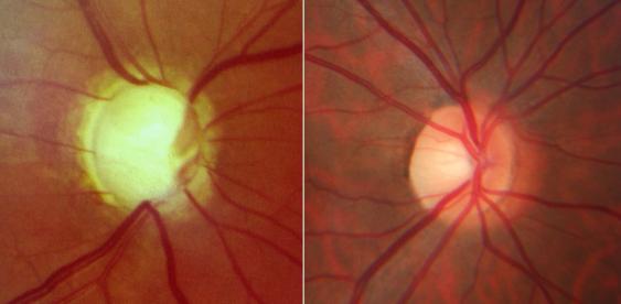 Abbildung 3: Gesunder Sehnerv (rechts) und geschädigter Sehnerv (links)
